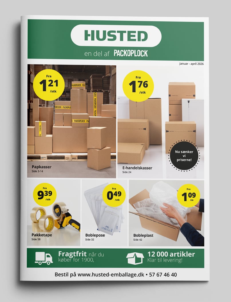 Hos Husted har vi alt indenfor emballage til dig, der skal beskytte, pakke og sende varer. Du finder et stort bredt udvalg af alt slags emballage til de fleste forsendelser, fra små til store genstande. Hos os finder du de rigtige kasser til dine produkter, alt efter dine behov, du kan vælge mellem de 520 forskellige papkasser vi har på lager. Vi tilbyder også pakketape, bobleplast, strækfilm og forsendelsesposer.